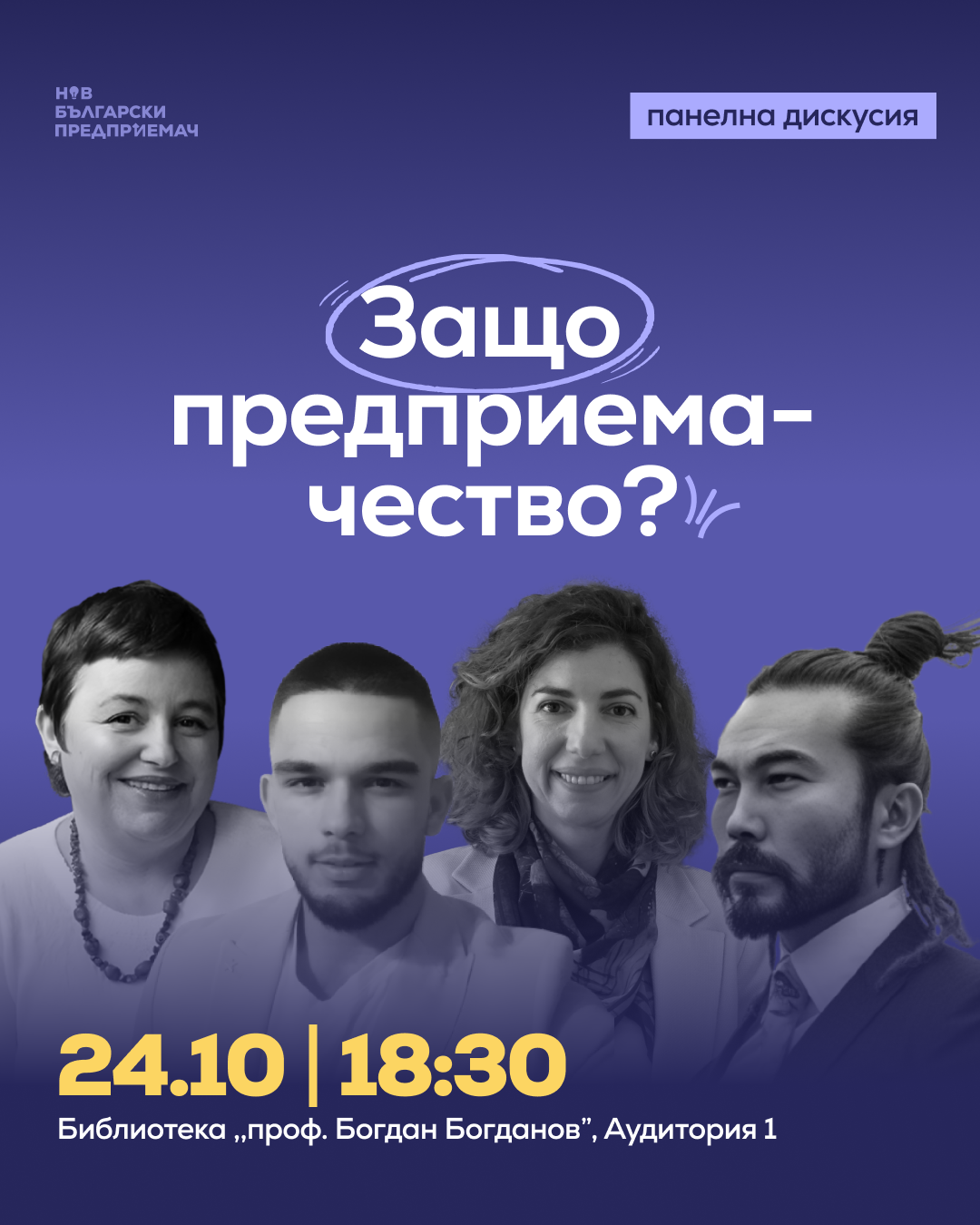 Клуб „Нов български предприемач“ има удоволствието да Ви покани на панелна дискусия на тема „Защо предприемачество?“, която ще се проведе на